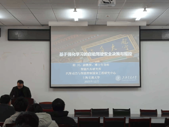 (星空体育登录网页入口 通讯员 代严松)12月17日上午,上海交通大学机械与动力工程学院副教授胡川应邀做客工科楼G-W408会议室,为星空体育登录网页入口师生作了题为“基于强化学习的自动驾驶安全决策与规控”的学术报告会。星空体育登录网页入口部分教师及硕士研究生参加了此次会议。