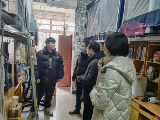 院领导一行来到25栋学生寝室进行走访,耐心地询问了学生对宿舍各项设施的适应情况及满意程度,又就行李的存放、交通出行、宿舍用电安全、以及返校后注意事项等方面事项进行了详细的叮嘱,确保学生在校的日常生活得到保障。同学们对老师们的到访非常惊喜,表示十分满意宿舍的情况,并认真聆听了老师们的嘱咐与教诲。期间,大家积极地与老师交流互动,宿舍内不时传来阵阵欢声笑语,气氛活泼愉快。
