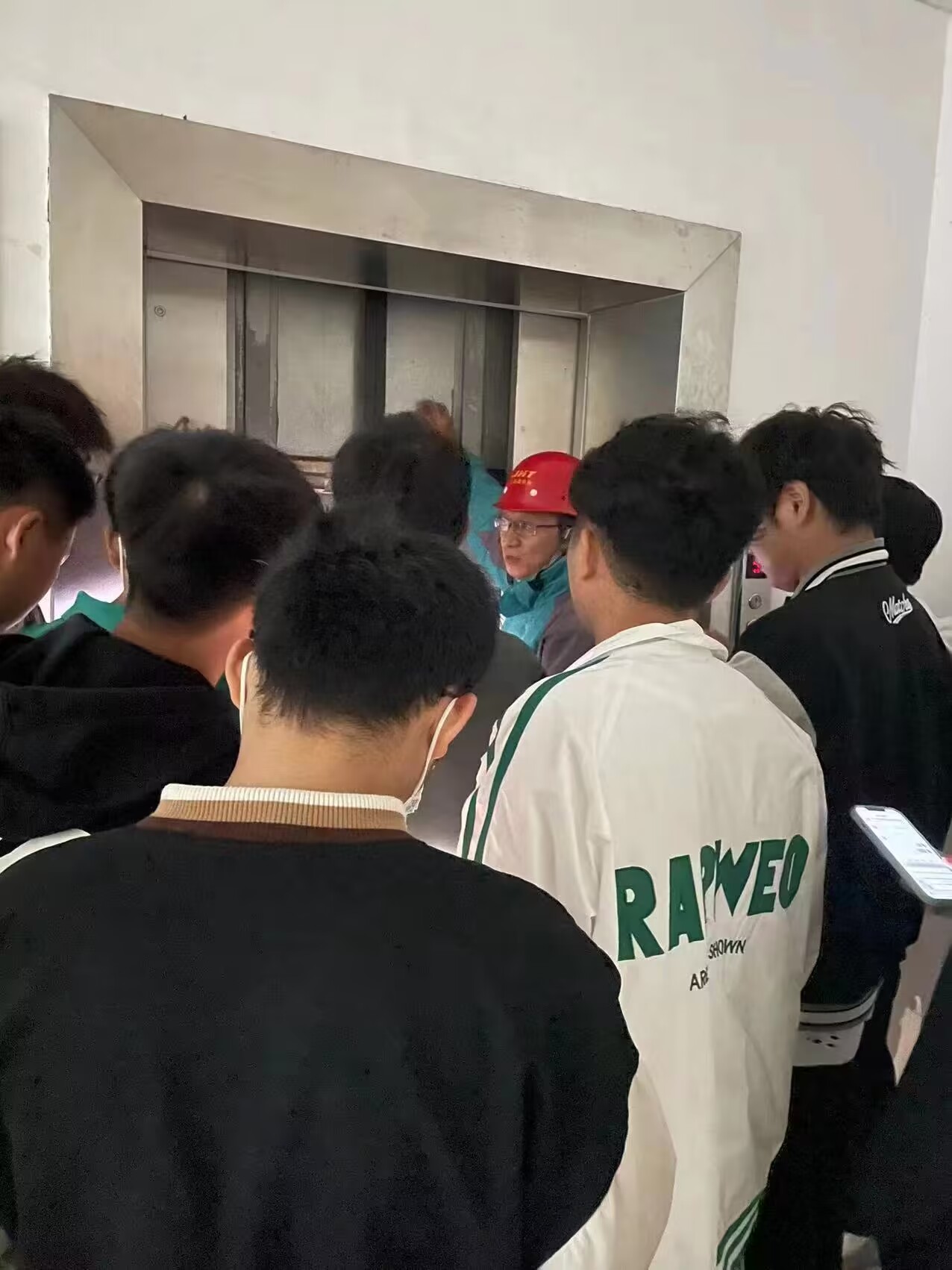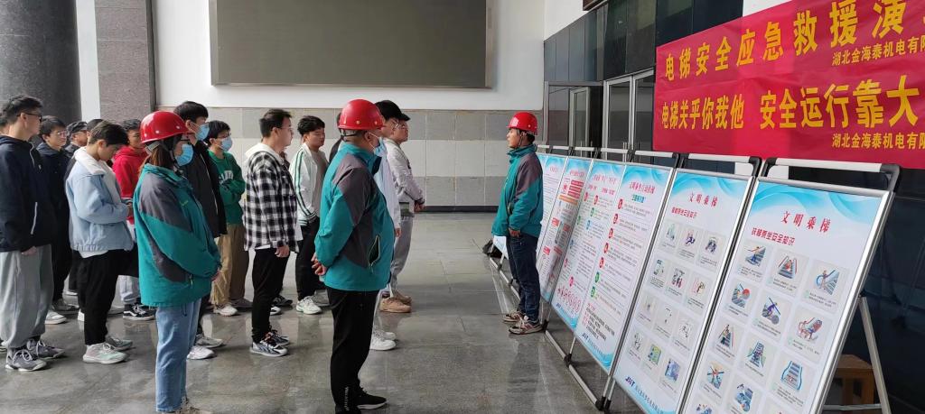首先,电梯维修技术人员给同学们进行了电梯安全知识的培训,同时讲解了电梯安全事故应对处置常识,随后利用工科楼电梯进行模拟突发事故的演练。