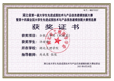 在学习上,许绪君刻苦努力,态度端正,讲究学习方法,注重学习效率,注意理论与实践的结合,注重学习能力培养。虽身兼数职,但始终将学习当成学生的本职工作,并秉持着“时间就像海绵里的水,挤挤总是有的”的观念。他积极参加各类学科专业竞赛,在大一时便有一年的实验室学习经历,自学Autocad、Solidworks、Proe、Pr等专业软件,并将其积极运用于专业学习和实验实训中。在老师指导下,许绪君积极参加各类学科竞赛,获得第14届全国大学生先进成图技术大赛省级个人全能二等奖、第13届全国3D大赛湖北省二等奖、大学生创新创业大赛校级立项并结题。