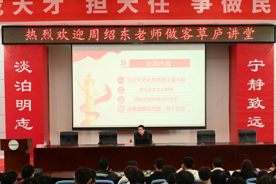 会议伊始,周绍东教授明确了此次草庐讲堂的主题——“深入贯彻学习习近平文化思想”,而后沿“习近平文化思想的主要内容”、“文化及文化的多样性”、“共时态的中国当代文化”、“准确理解和把握‘两个结合’”的交流内容,思路清晰、风趣幽默的为同学们讲了一堂生动的思政课。