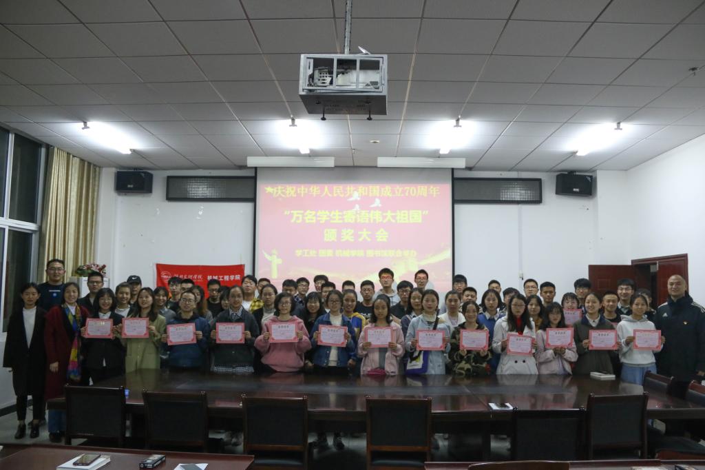 (机械学院 通讯员 屈林风 赵延凯)10月22日下午6点30分星空体育登录网页入口学习双推部在工科楼408会议室举行“万名学子寄语伟大祖国”活动表彰大会。参加活动的嘉宾有图书馆朱华琴老师、星空体育登录网页入口党委副书记王超、学工办主任徐一刚、星空体育登录网页入口学生会主席陈沿宏。大会由姜潍、王毅主持。 六名选手代表上台朗诵获奖作品,慷慨激昂的语调表达了自己对伟大祖国的热爱与祝福。作品各有特色,如余芊深情款款的散文、宋新建铿锵有力的诗歌、李玉琪耐人寻味的古文等给人留下深刻的印象。 随后朱华琴从文章格式、行文方法、材料安排、台上表现等方面为选手进行了点评。朱华琴说到:“除学术论文以外,一定要学会讲故事,希望同学们以小人物的故事联系到国家命运从平凡中看到不凡,以小见大。"并希望同学们参加一次活动,成长一次,写作提高一次。 会议至此落下帷幕,此次活动激励了各院学生们的爱国、爱党情怀,也使更多人听到了各院学生异体同心地发出了对祖国的赞美和祝福,为爱国主义教育献上了一份力量。