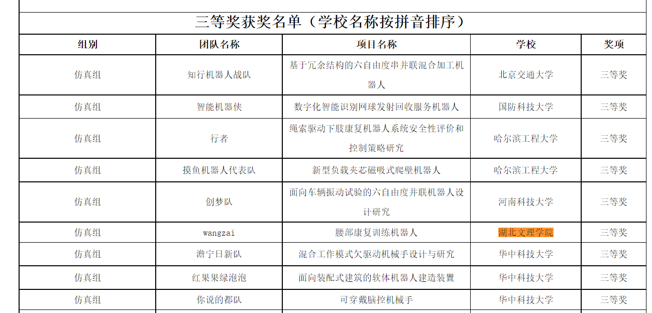 (机械学院 通讯员 秦涛)8月24-25日,“光谷杯”第三届中国研究生机器人创新设计大赛全国总决赛在华中科技大学举行,决赛采用线上“视频展示+PPT答辩”的方式。我校星空体育登录网页入口秦涛老师指导的研究生刘鹏、任鹏、马渊明、邱金星、魏超完成的项目《腰部康复训练机器人》荣获全国三等奖,是所有获奖单位中唯一一所冠名“学院”的高校。